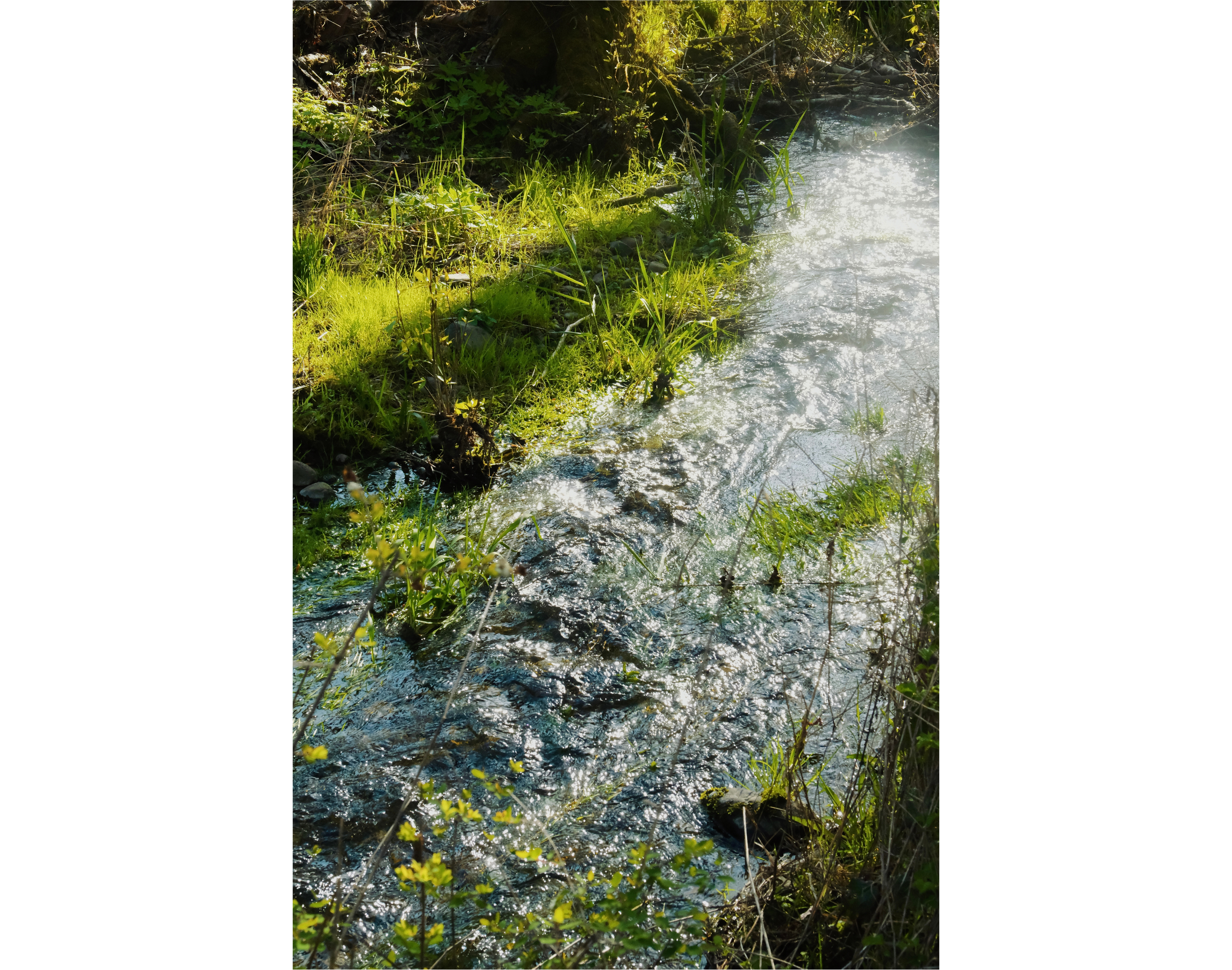 I call Jordan over to check out this auto body I’ve found sinking into the ground, and they find me with a rainbow over my head. We decide to give up on our morel forage and give gratitude to the forest for our nettles. As we walk out the way we came, we realize the fawn needs flowers. Jordan searches for something in the brush and returns with a blossoming Oregon grape cluster they place next to her head. We breathe goodbye, knowing the next time we return she will have become the forest. As we pack up the car to leave, a couple approaches the path, and we watch as they encounter the fawn just as we did—gasping, looking at each other, staring, then pulling out their phones to take a photo.