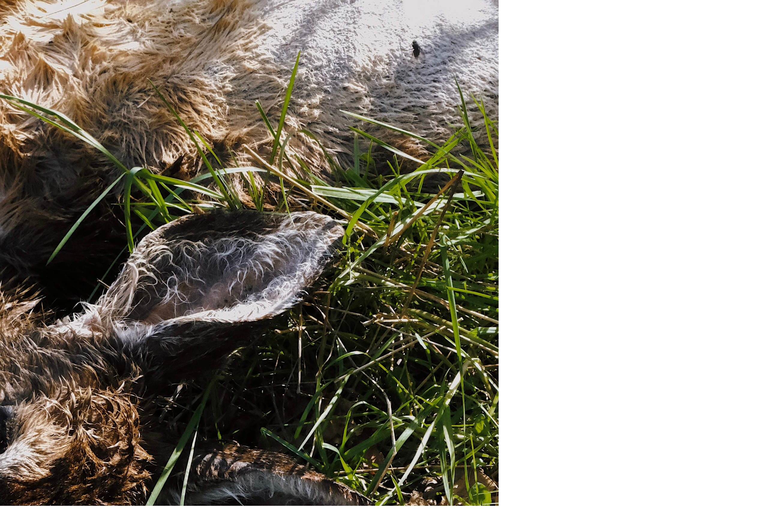 Jordan walks a few steps ahead of me, then stops, abruptly. I walk over to see what they see—a dead fawn with their eyes open, sweaty fur curling all over her body. She is long dead but in this light, she feels so close to being alive. The flies haven’t even started dancing around her yet. We look at each other, then back at her, staring and saying nothing for a while. I expect her to smell like something but it’s too faint to tell. The air just smells like spring green and car exhaust. We agree that this death must still be very fresh and, recognizing how rare and beautiful this encounter is, slowly we each decide to take a photo of her body.
