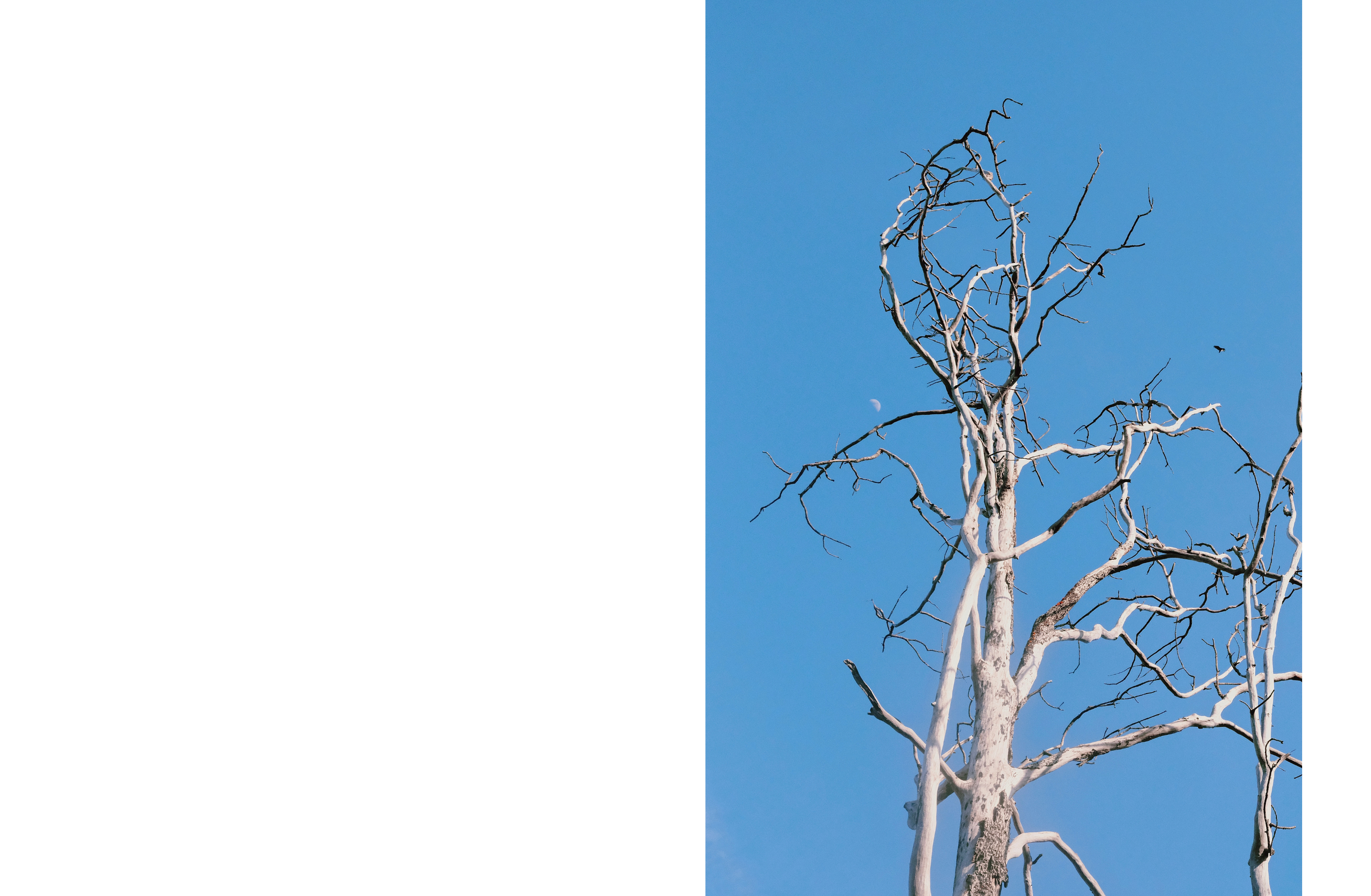 We drive a bit farther down the road. Jordan knows of a house-turned-forest fire that happened recently near this area. We find the spot, marked by a vulture staking their territory in a burnt tree. The tree’s long limbs have turned into spindly skeletons glowing bone-white against the blue sky. A few more vultures circle above us, and we wonder if they’ve spotted what we saw just a few minutes away. Jordan, always a few steps ahead of me, gasps and tells me another deer has died. This carcass is different though. It is no longer deer, just bones and small bits of offal. This body had been picked clean. Jordan disappears into the brush and I follow, averting my eyes as I pass the blushing purple intestines.